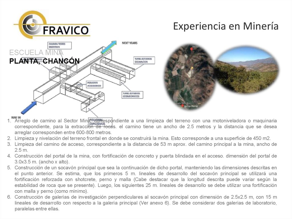 el punto anterior. Se estima, que los primeros 5 m. lineales de desarrollo del socavón principal se utilizará una