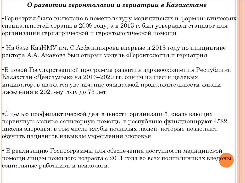 О развитии геронтологии и гериатрии в Казахстане•Гериатрия была включена в номенклатуру медицинских и фармацевтических