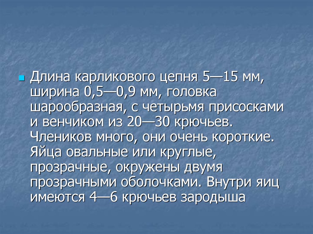 Длина карликового цепня 5—15 мм,ширина 0,5—0,9 мм, головка