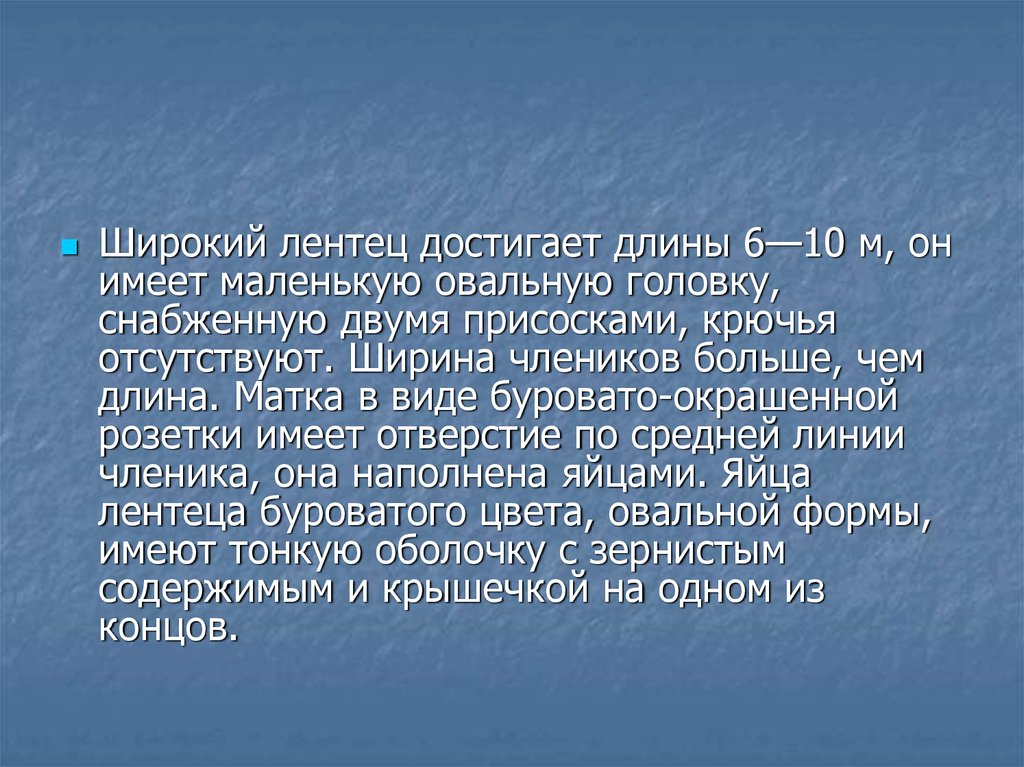 Широкий лентец достигает длины 6—10 м, онимеет маленькую овальную головку,