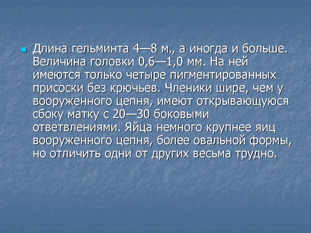 Длина гельминта 4—8 м., а иногда и больше.Величина головки 0,6—1,0 мм. На ней