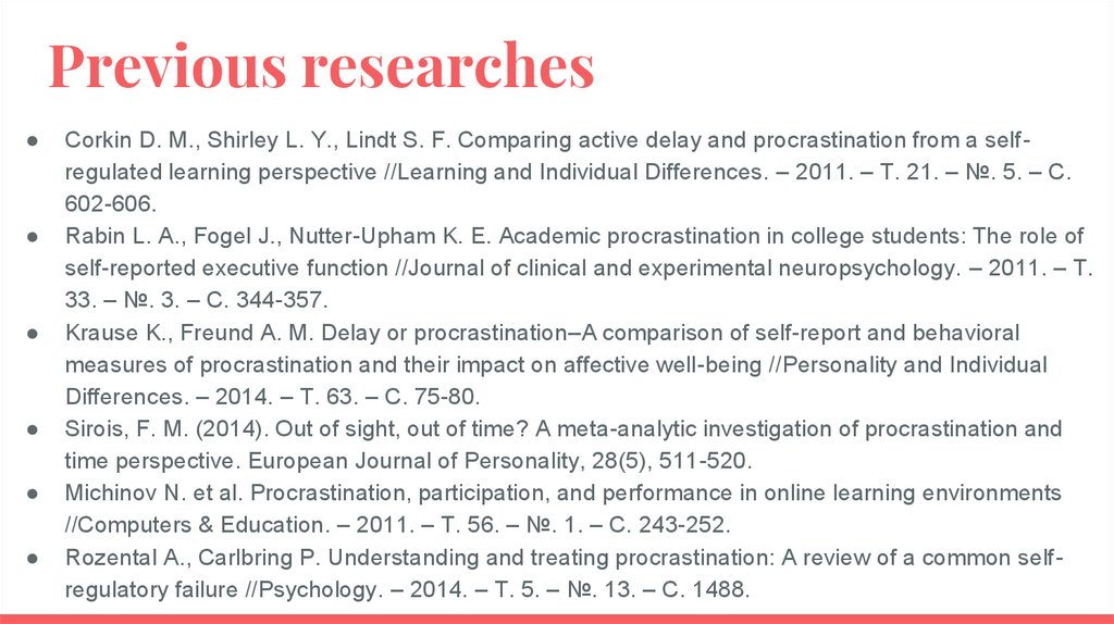 Previous researchesCorkin D. M., Shirley L. Y., Lindt S. F. Comparing active delay and procrastination from a selfregulated learning perspective //Learning and Individual Differences. – 2011. – Т. 21. – №. 5. – С.