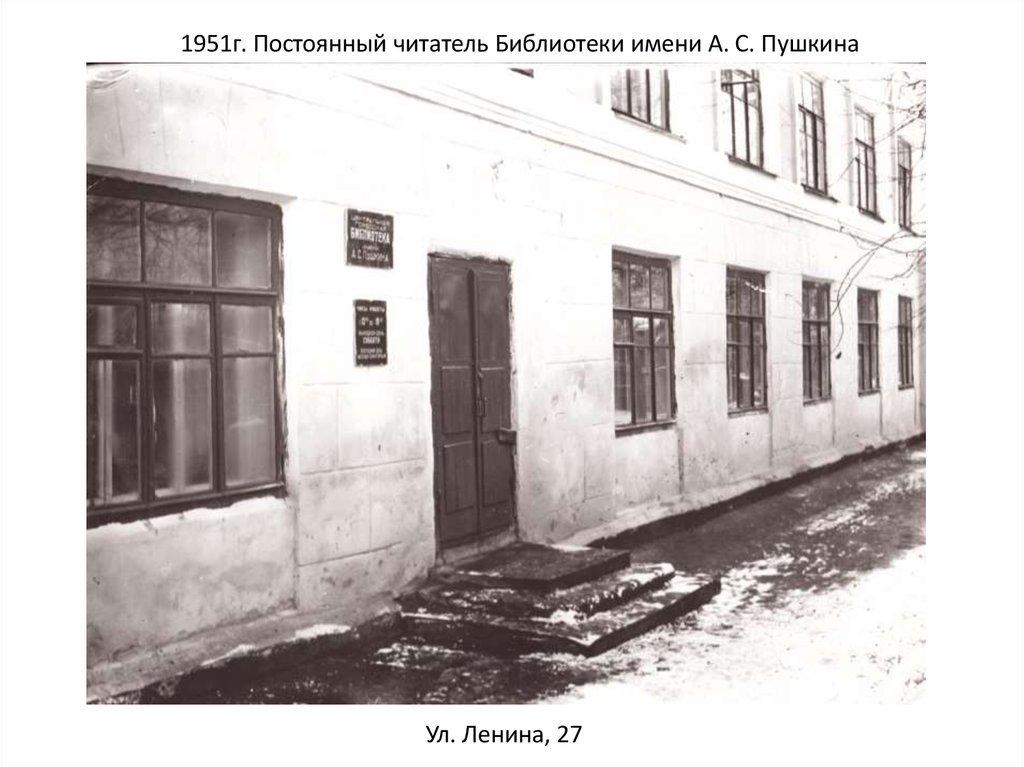 1951г. Постоянный читатель Библиотеки имени А. С. ПушкинаУл. Ленина, 27