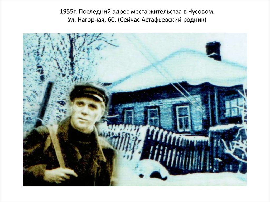 1955г. Последний адрес места жительства в Чусовом.Ул. Нагорная, 60. (Сейчас Астафьевский родник)