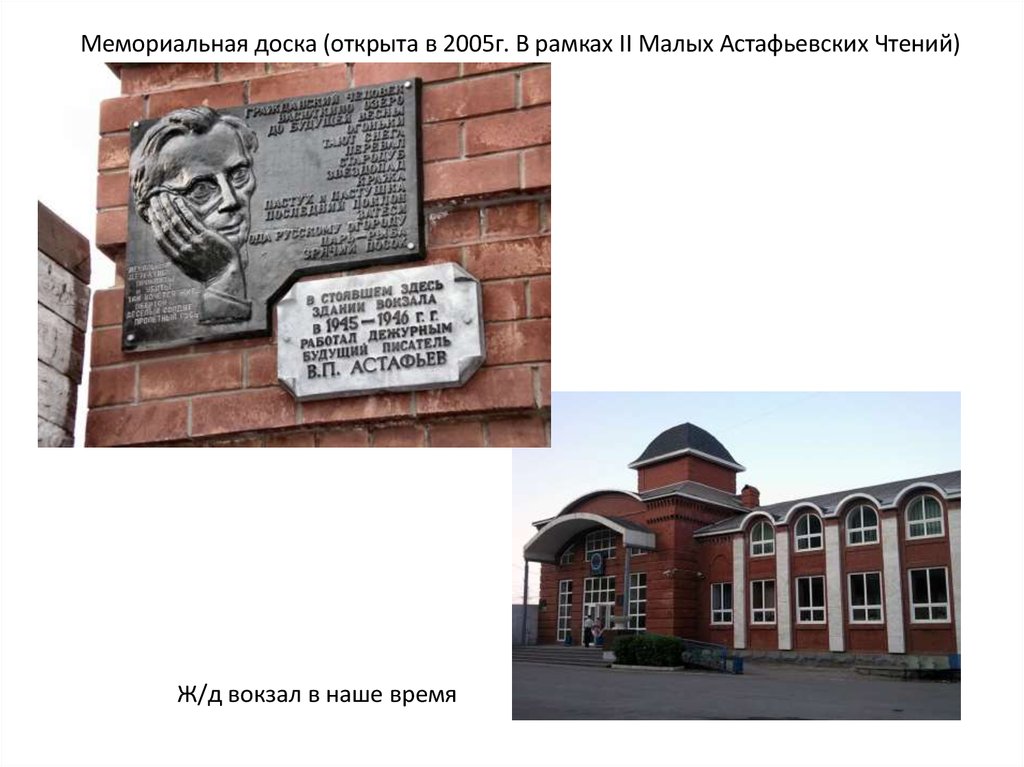 Мемориальная доска (открыта в 2005г. В рамках II Малых Астафьевских Чтений)Ж/д вокзал в наше время