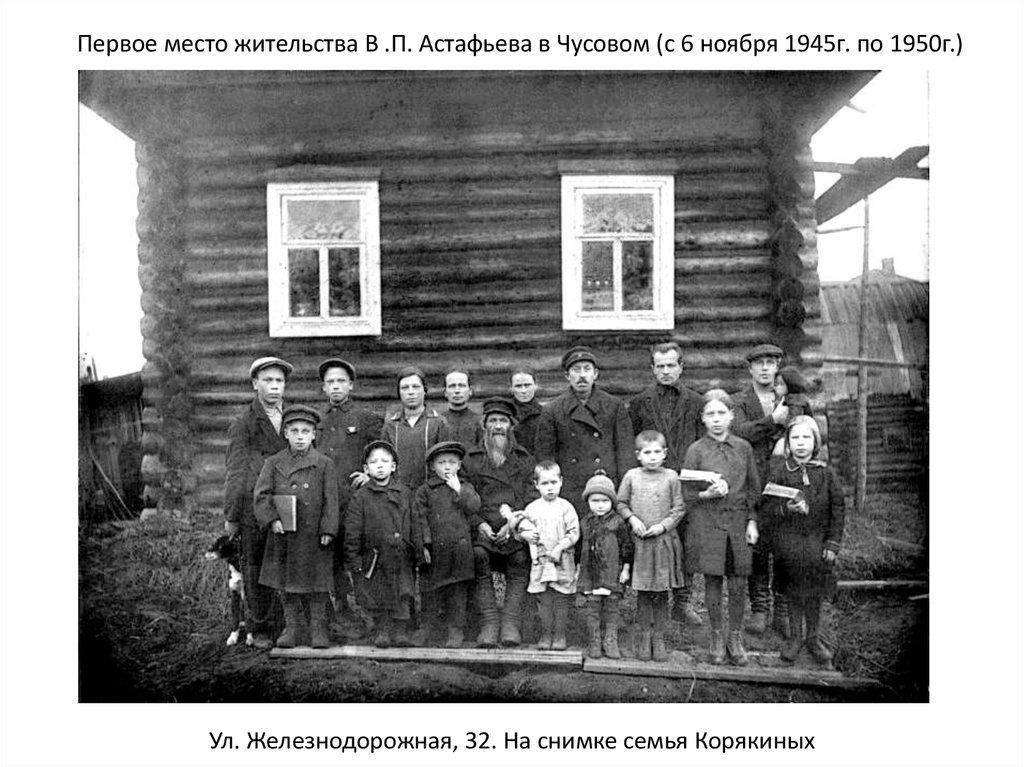 Первое место жительства В .П. Астафьева в Чусовом (с 6 ноября 1945г. по 1950г.)Ул. Железнодорожная, 32. На снимке семья Корякиных