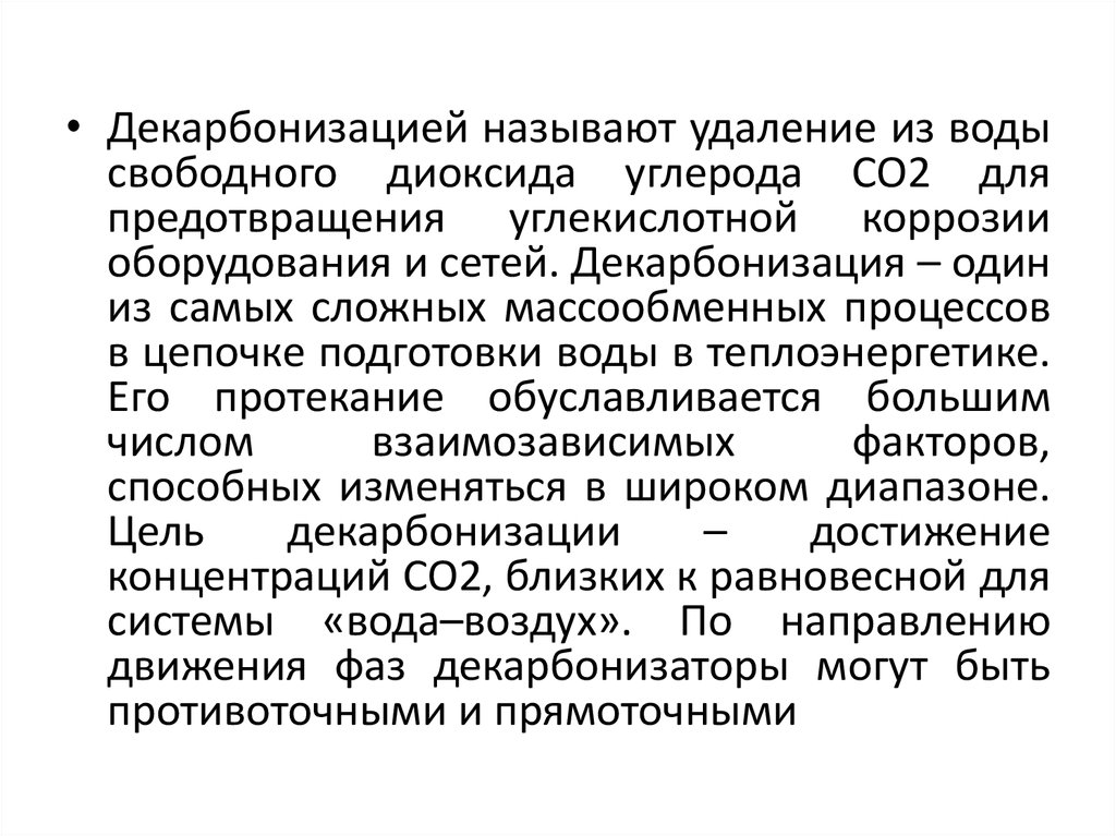 • Декарбонизацией называют удаление из водысвободного диоксида углерода СО2 для