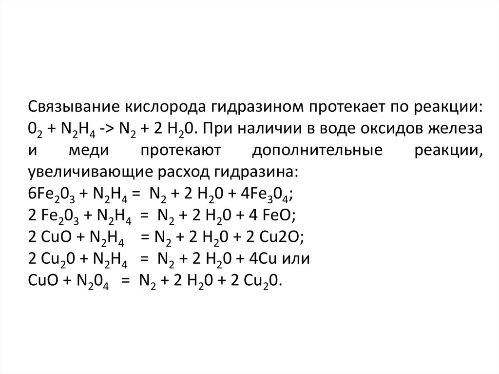 Связывание кислорода гидразином протекает по реакции:02 + N2H4 -> N2 + 2 Н20. При наличии в воде оксидов железа
