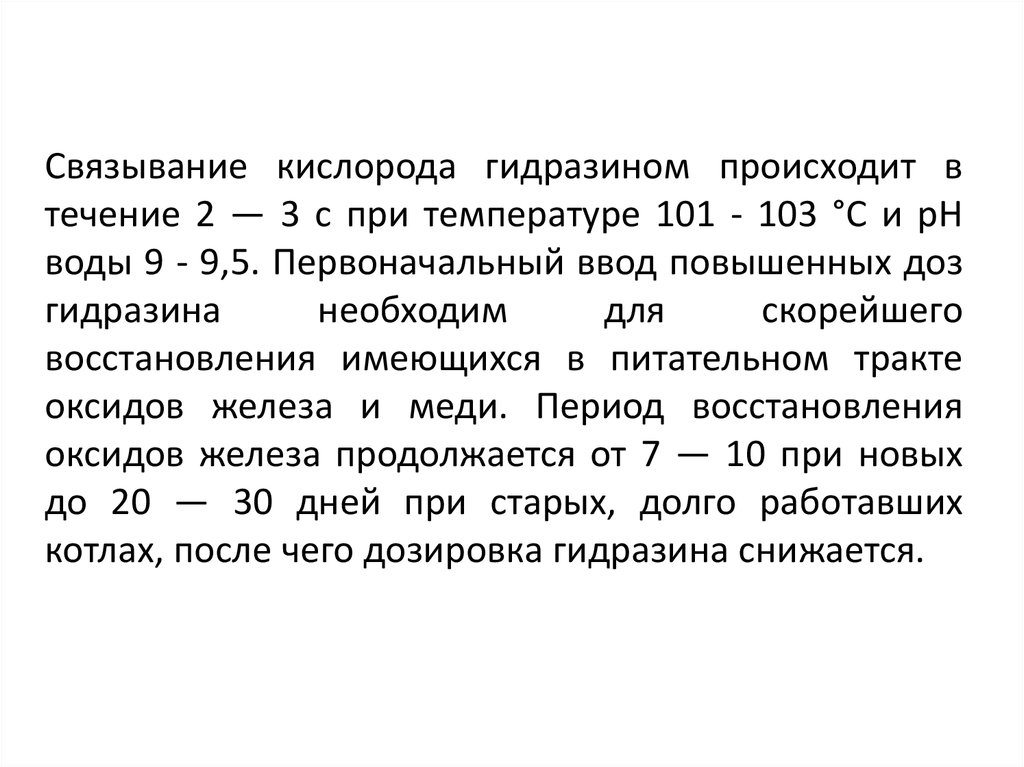 Связывание кислорода гидразином происходит втечение 2 — 3 с при температуре 101 - 103 °С и pH