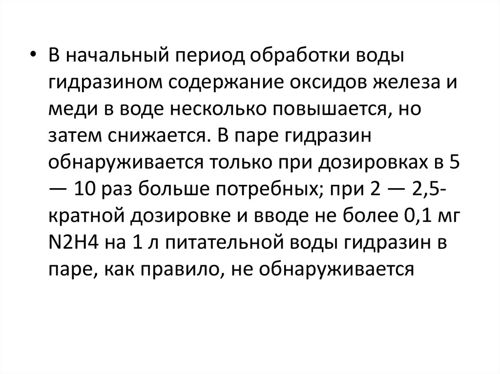 • Обработка питательной воды гидразиномпроизводится для связывания остаточных количеств