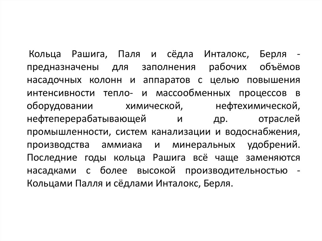 Кольца Рашига, Паля и сёдла Инталокс, Берля предназначены для заполнения рабочих объёмовнасадочных колонн и аппаратов с целью повышения