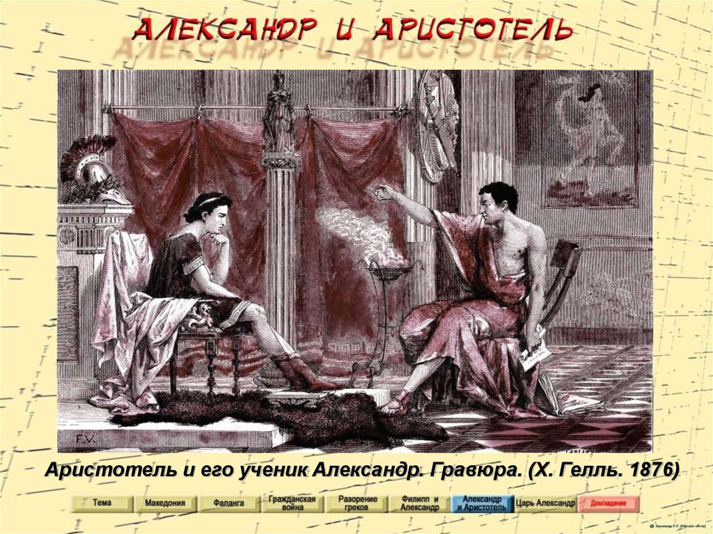 Аристотель и его ученик Александр. Гравюра. (Х. Гелль. 1876)