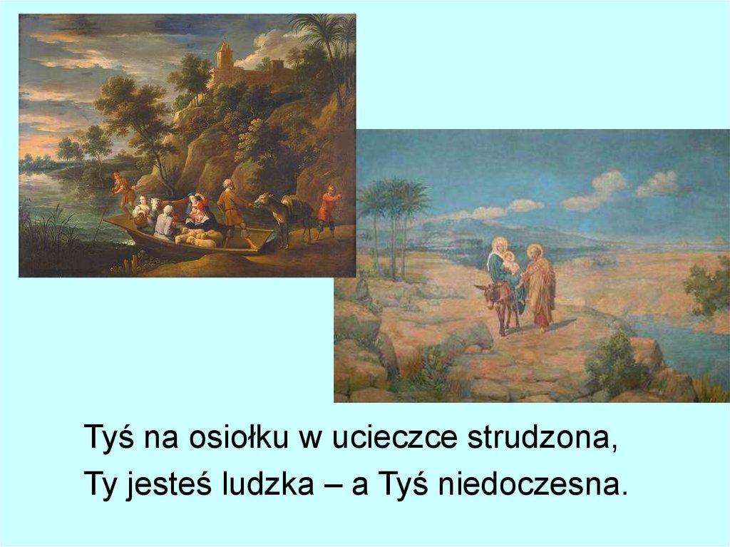 Tyś na osiołku w ucieczce strudzona,Ty jesteś ludzka – a Tyś niedoczesna.