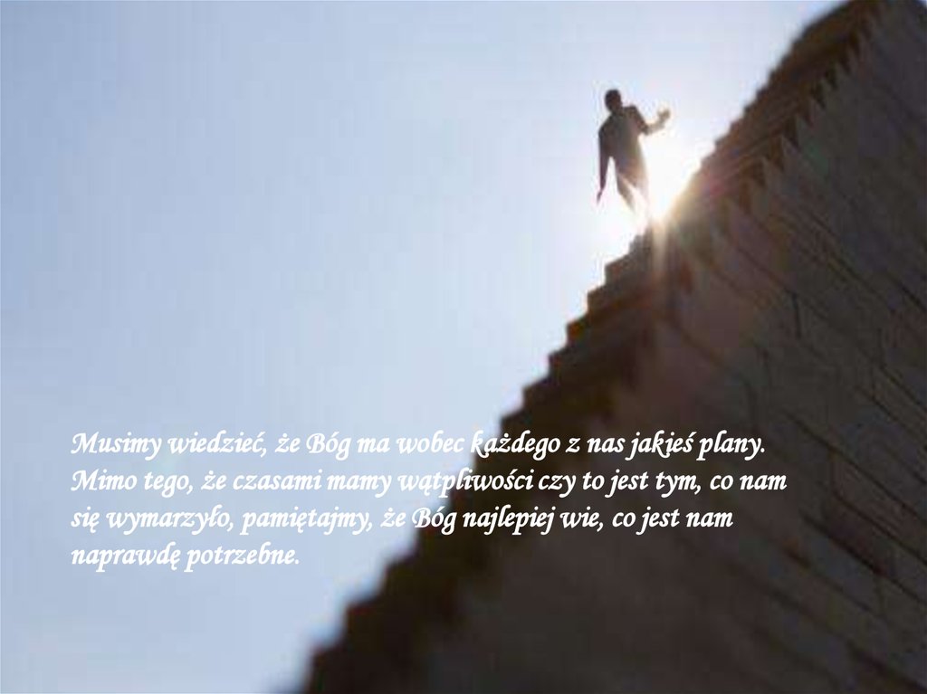 Musimy wiedzieć, że Bóg ma wobec każdego z nas jakieś plany.Mimo tego, że czasami mamy wątpliwości czy to jest tym, co nam