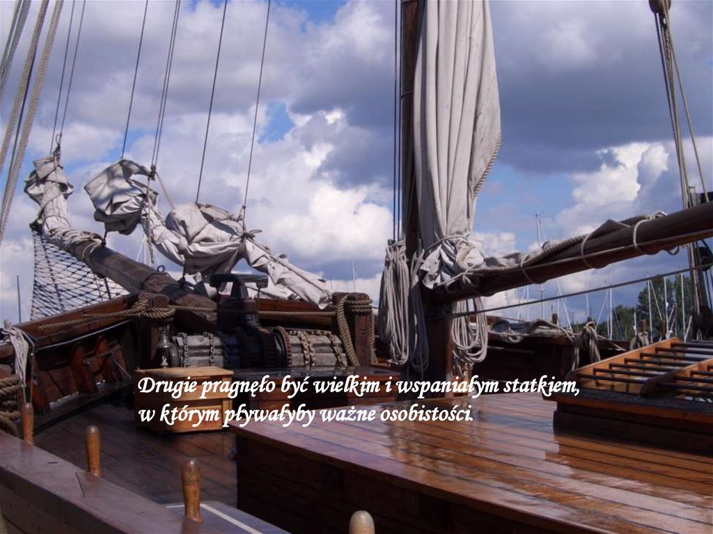Drugie pragnęło być wielkim i wspaniałym statkiem,w którym pływałyby ważne osobistości.