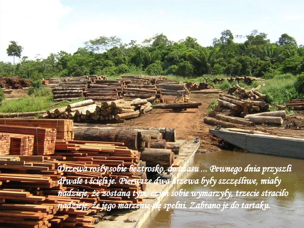 Drzewa rosły sobie beztrosko, do czasu ... Pewnego dnia przyszlidrwale i ścięli je. Pierwsze dwa drzewa były szczęśliwe, miały