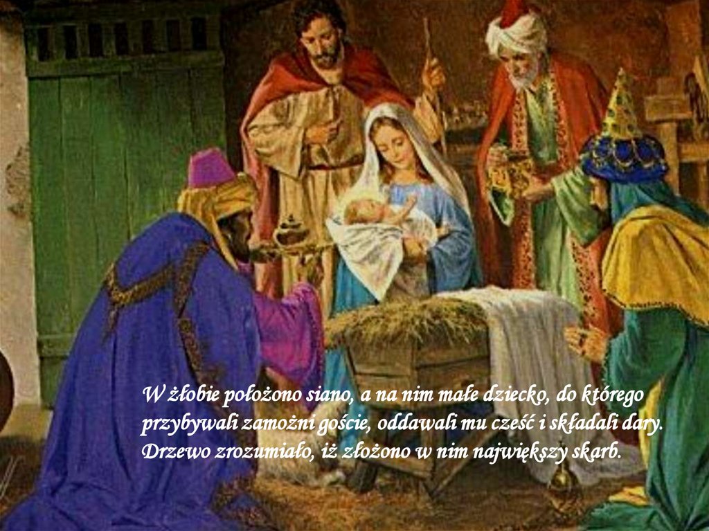 W żłobie położono siano, a na nim małe dziecko, do któregoprzybywali zamożni goście, oddawali mu cześć i składali dary.