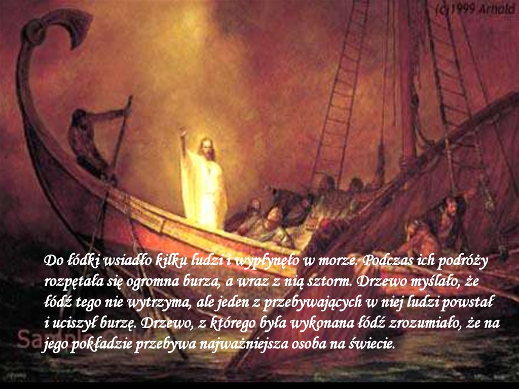 i uciszył burzę. Drzewo, z którego była wykonana łódź zrozumiało, że na