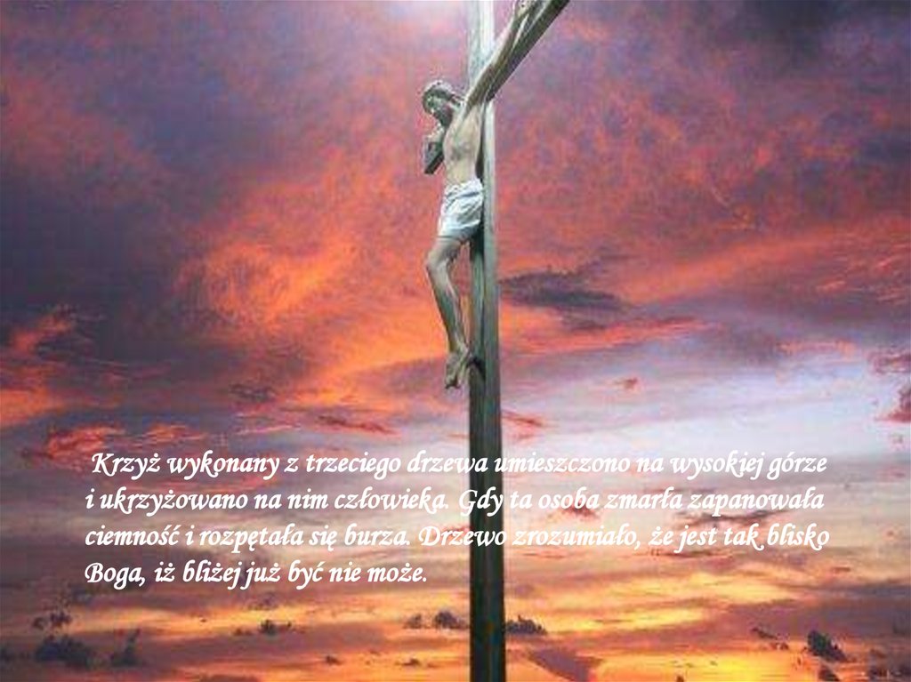 Krzyż wykonany z trzeciego drzewa umieszczono na wysokiej górzei ukrzyżowano na nim człowieka. Gdy ta osoba zmarła zapanowała