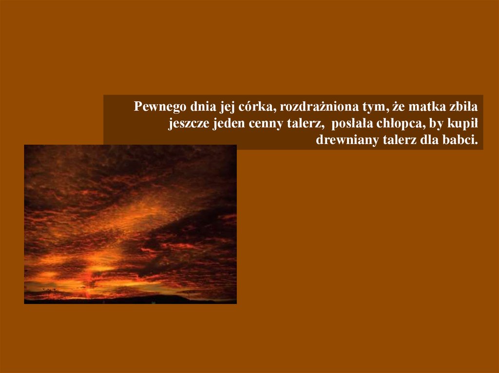 Pewnego dnia jej córka, rozdrażniona tym, że matka zbiłajeszcze jeden cenny talerz, posłała chłopca, by kupił