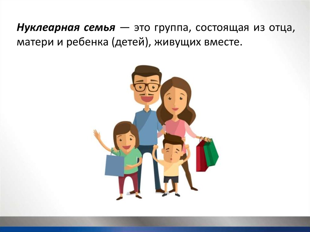 Нуклеарная семья — это группа, состоящая из отца,матери и ребенка (детей), живущих вместе.