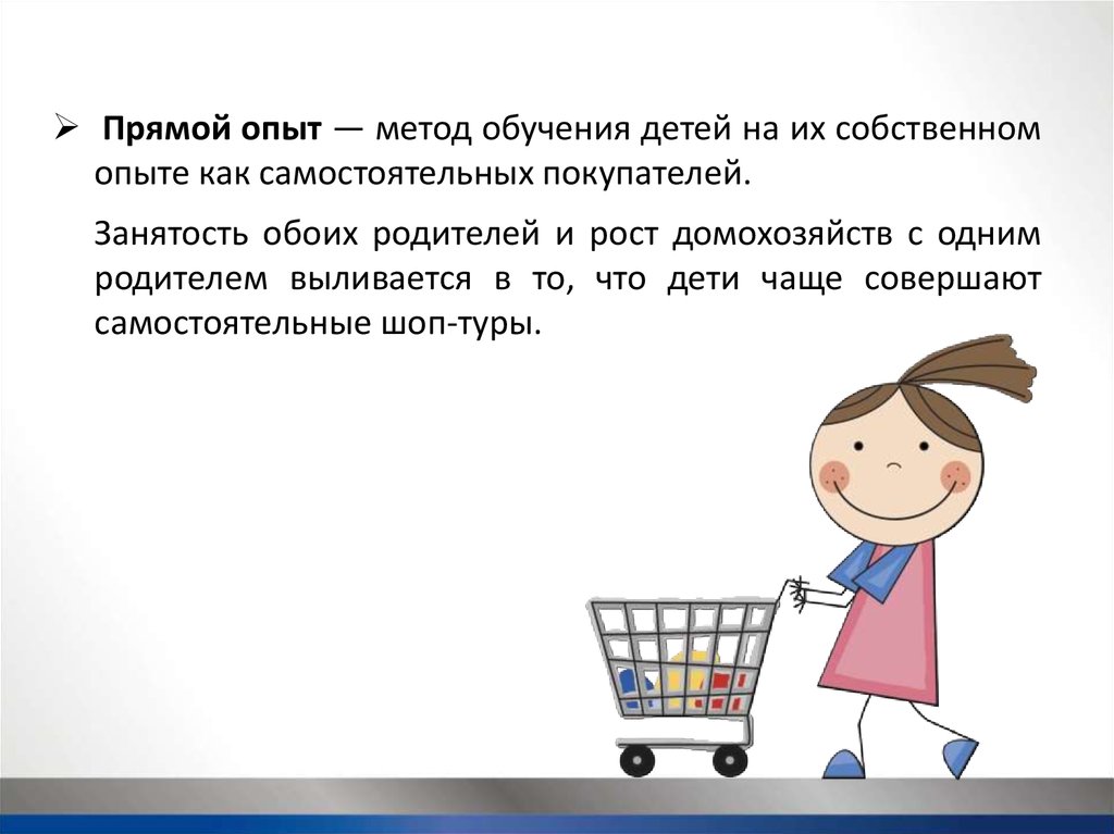 Прямой опыт — метод обучения детей на их собственномопыте как самостоятельных покупателей.