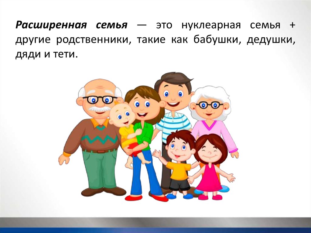 Расширенная семья — это нуклеарная семья +другие родственники, такие как бабушки, дедушки,