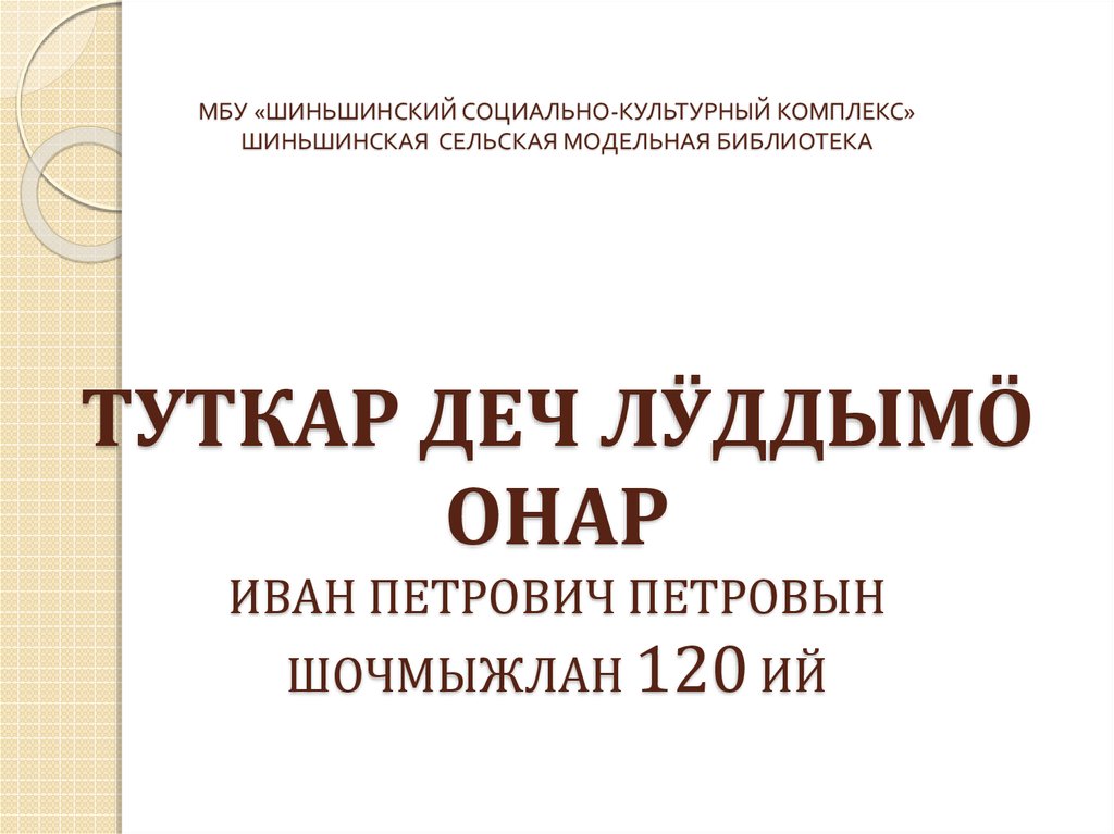 1. МБУ «ШИНЬШИНСКИЙ СОЦИАЛЬНО-КУЛЬТУРНЫЙ КОМПЛЕКС» ШИНЬШИНСКАЯ СЕЛЬСКАЯ МОДЕЛЬНАЯ БИБЛИОТЕКА ТУТКАР ДЕЧ ЛӰДДЫМӦ ОНАР ИВАН ПЕТРОВИЧ