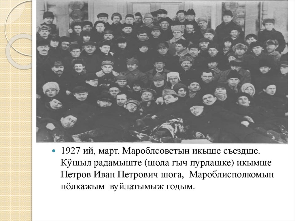 1927 ий, март. Мароблсоветын икыше съездше.Кӱшыл радамыште (шола гыч пурлашке) икымше