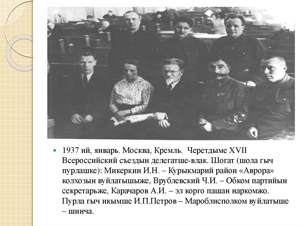 1937 ий, январь. Москва, Кремль. Черетдыме XVIIВсероссийский съездын делегатше-влак. Шогат (шола гыч