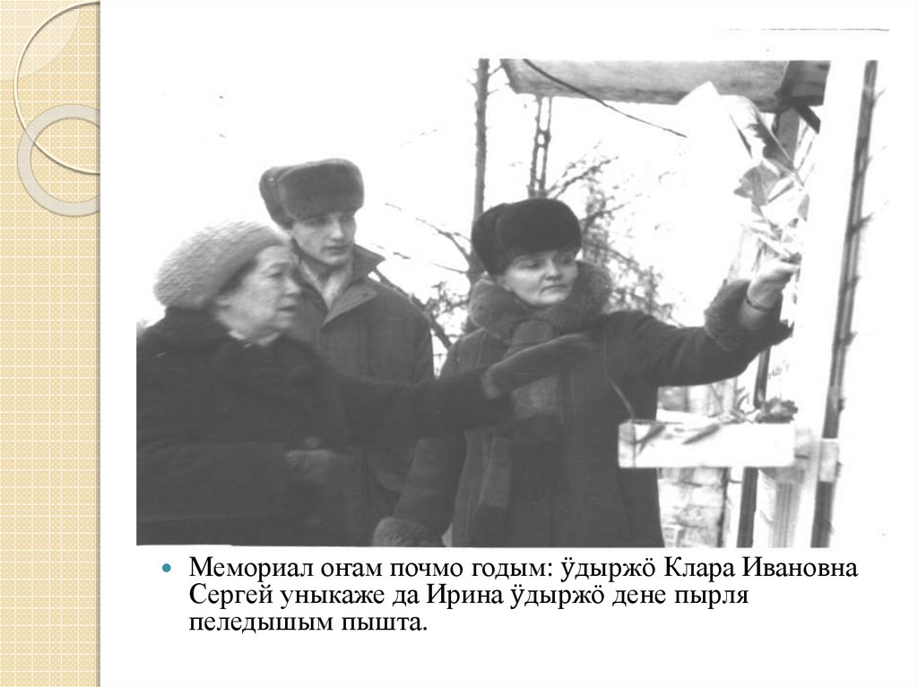 Мемориал оҥам почмо годым: ӱдыржӧ Клара ИвановнаСергей уныкаже да Ирина ӱдыржӧ дене пырля