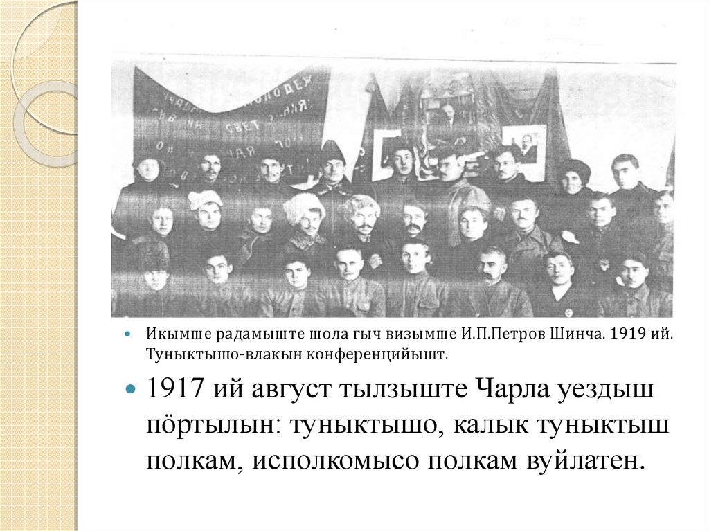 Икымше радамыште шола гыч визымше И.П.Петров Шинча. 1919 ий.Туныктышо-влакын конференцийышт.