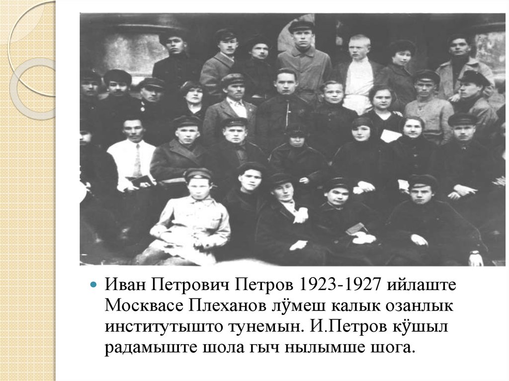 Иван Петрович Петров 1923-1927 ийлаштеМосквасе Плеханов лӱмеш калык озанлык