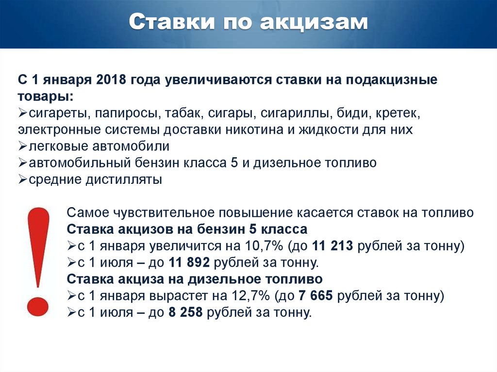 Ставки по акцизамС 1 января 2018 года увеличиваются ставки на подакцизные