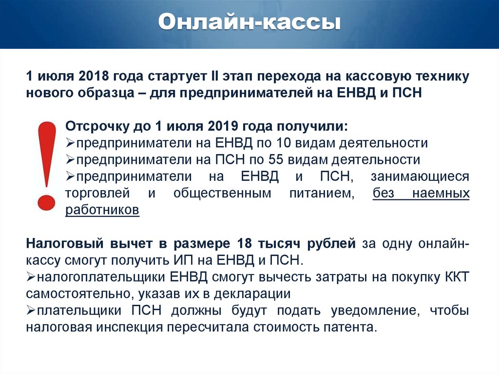 Налоговый вычет в размере 18 тысяч рублей за одну онлайнкассу смогут получить ИП на ЕНВД и ПСН.
