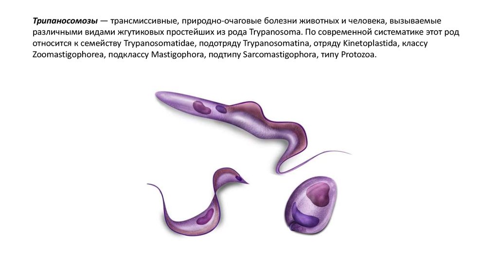 Трипаносомозы — трансмиссивные, природно-очаговые болезни животных и человека, вызываемыеразличными видами жгутиковых простейших из рода Trypanosoma. По современной систематике этот род