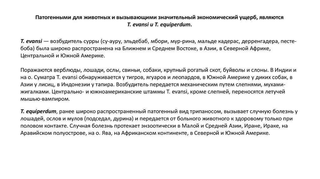 Патогенными для животных и вызывающими значительный экономический ущерб, являютсяТ. evansi и Т. equiperdum.