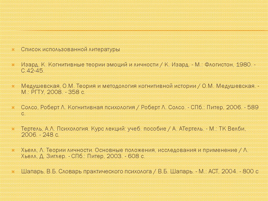 Список использованной литературыИзард, К. Когнитивные теории эмоций и личности / К. Изард. - М.: Флогистон, 1980. С.42-45.