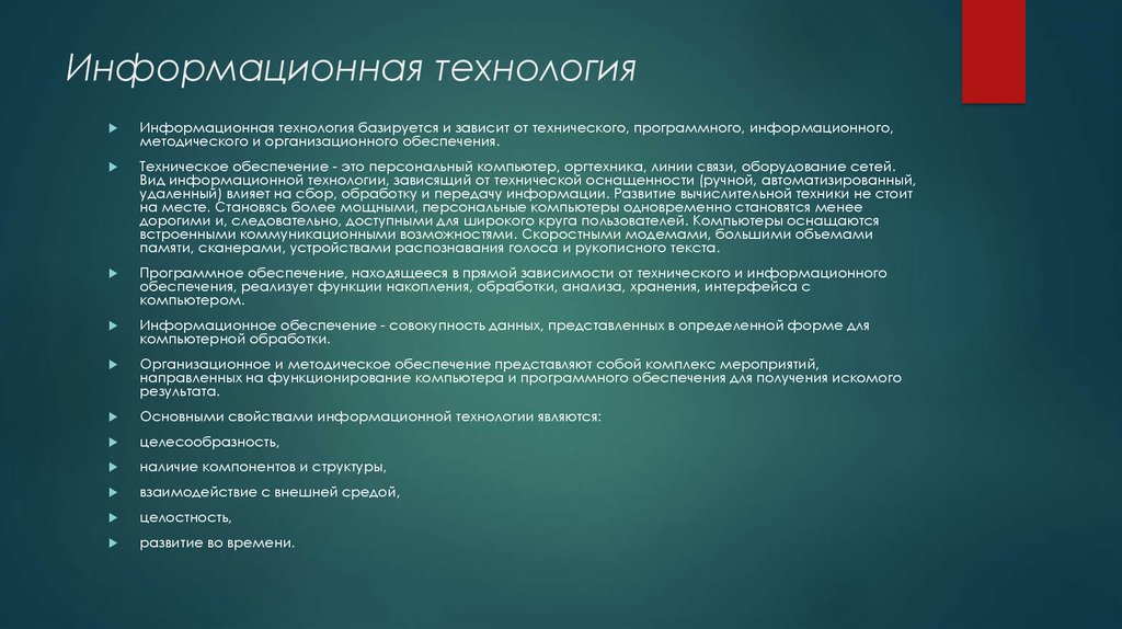 Информационная технология базируется и зависит от технического, программного, информационного,методического и организационного обеспечения.