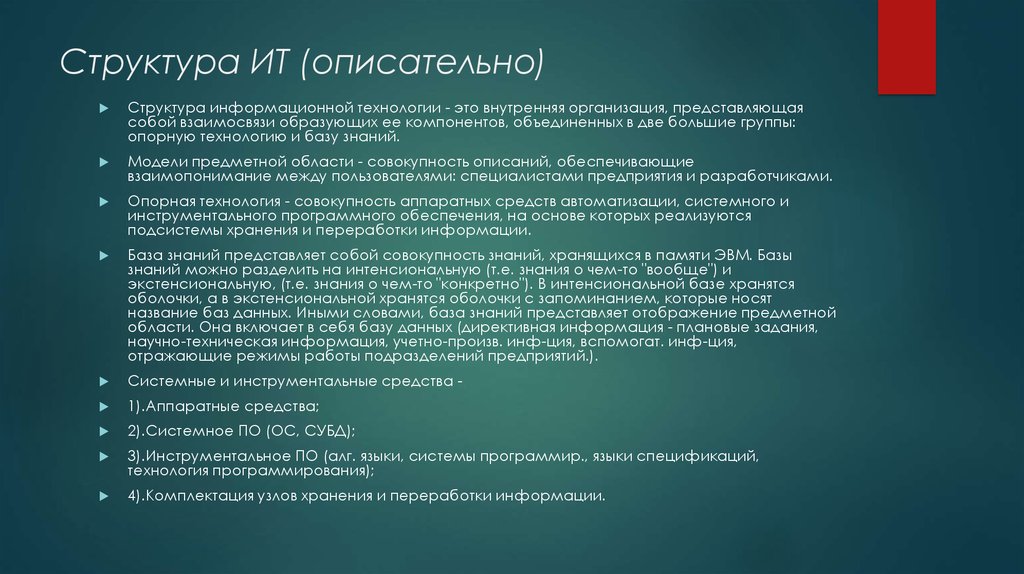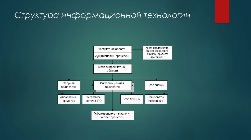 Структура информационной технологии - это внутренняя организация, представляющаясобой взаимосвязи образующих ее компонентов, объединенных в две большие группы: