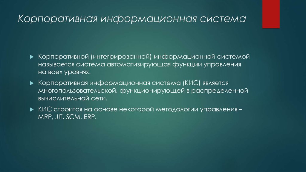 Корпоративной (интегрированной) информационной системойназывается система автоматизирующая функции управления