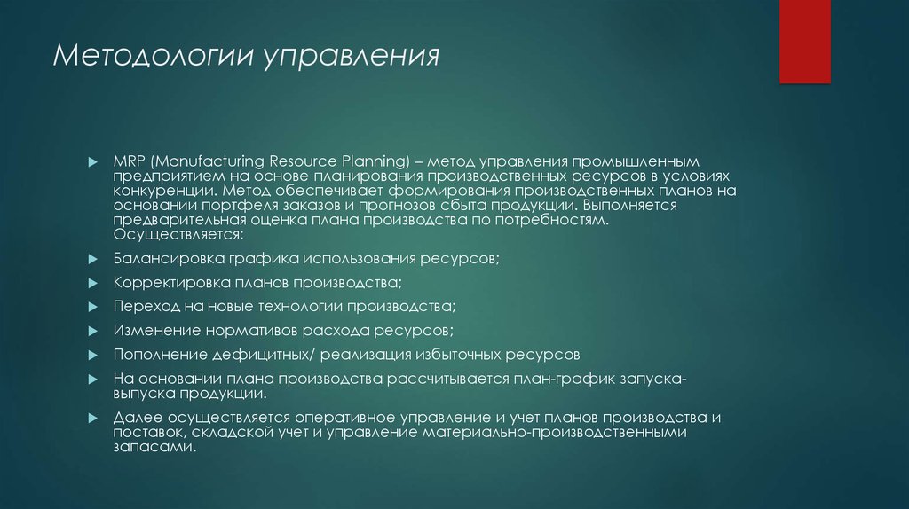 MRP (Manufacturing Resource Planning) – метод управления промышленнымпредприятием на основе планирования производственных ресурсов в условиях