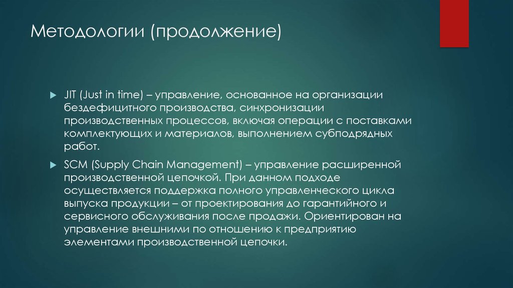 JIT (Just in time) – управление, основанное на организациибездефицитного производства, синхронизации