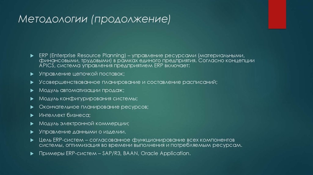 ERP (Enterprise Resource Planning) – управление ресурсами (материальными,финансовыми, трудовыми) в рамках единого предприятия. Согласно концепции
