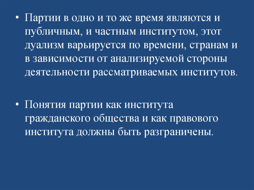 • Партии в одно и то же время являются ипубличным, и частным институтом, этот