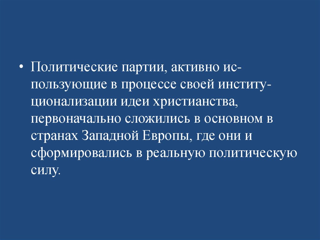 • Политические партии, активно использующие в процессе своей институционализации идеи христианства,первоначально сложились в основном в