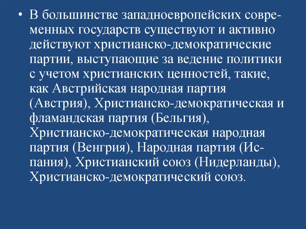 • В большинстве западноевропейских современных государств существуют и активнодействуют христианско-демократические