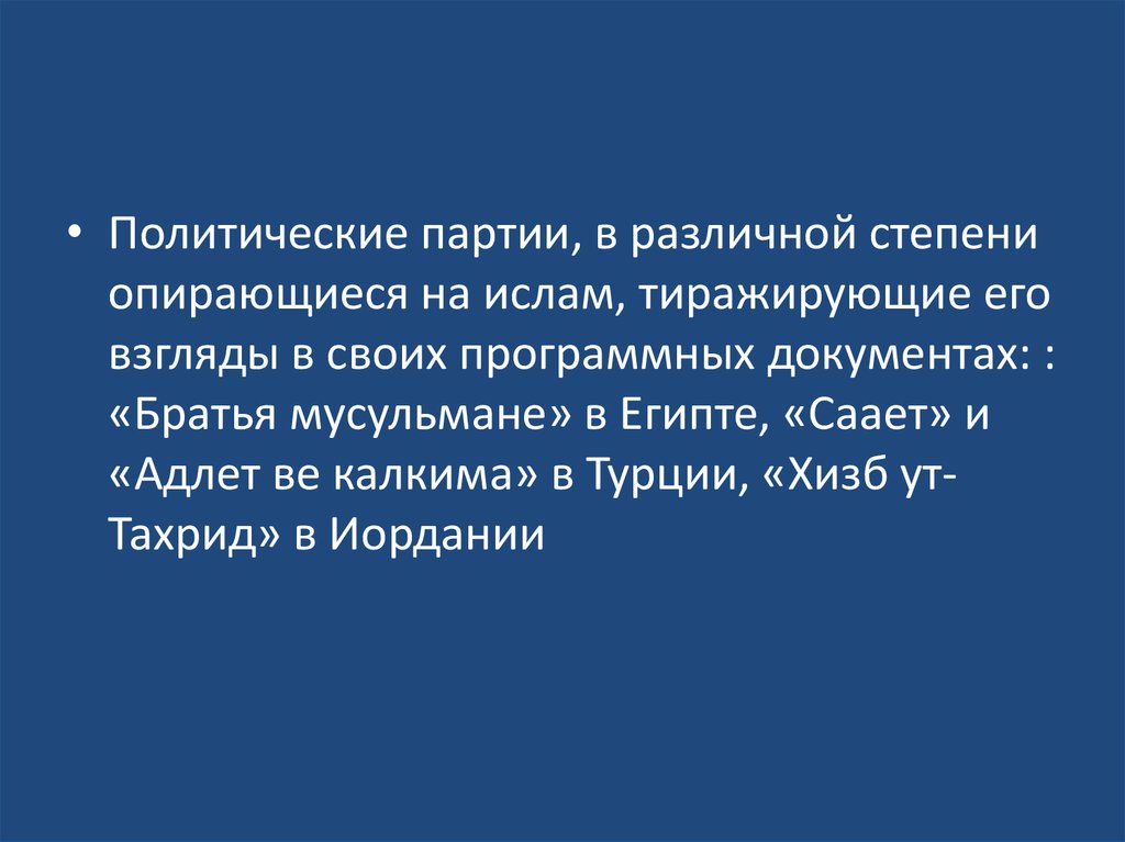 • Политические партии, в различной степениопирающиеся на ислам, тиражирующие его