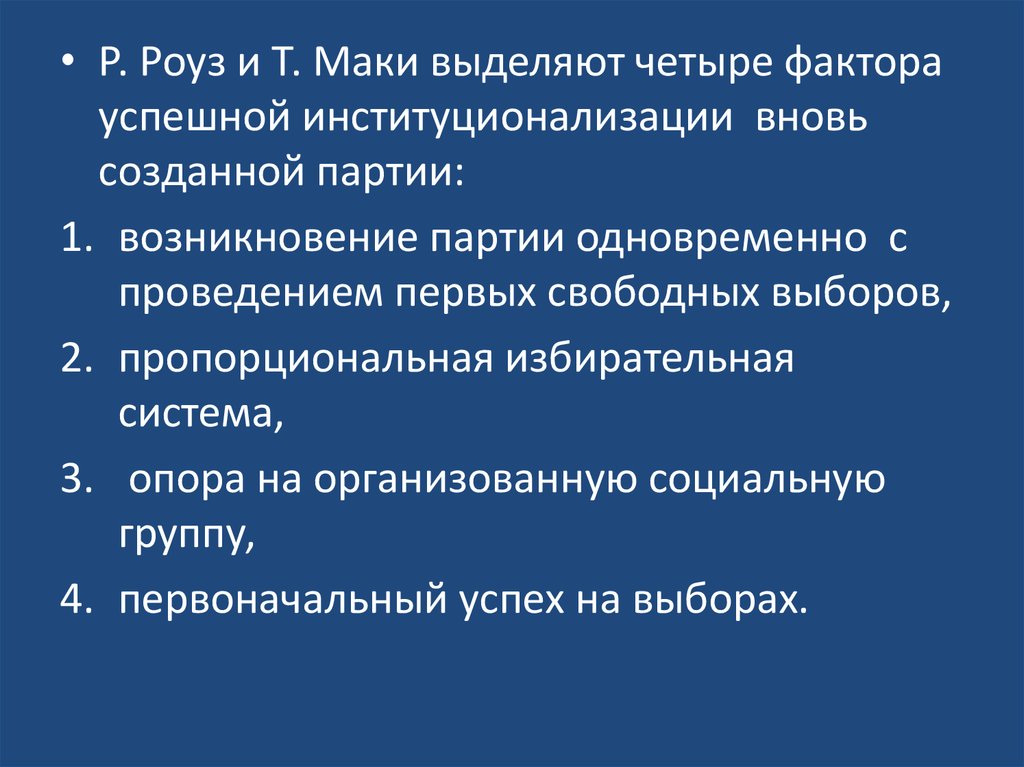 • Р. Роуз и Т. Маки выделяют четыре факторауспешной институционализации вновь
