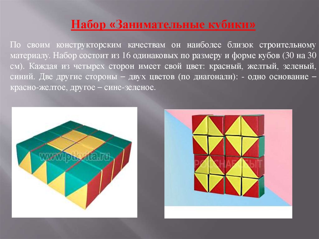 материалу. Набор состоит из 16 одинаковых по размеру и форме кубов (30 на 30